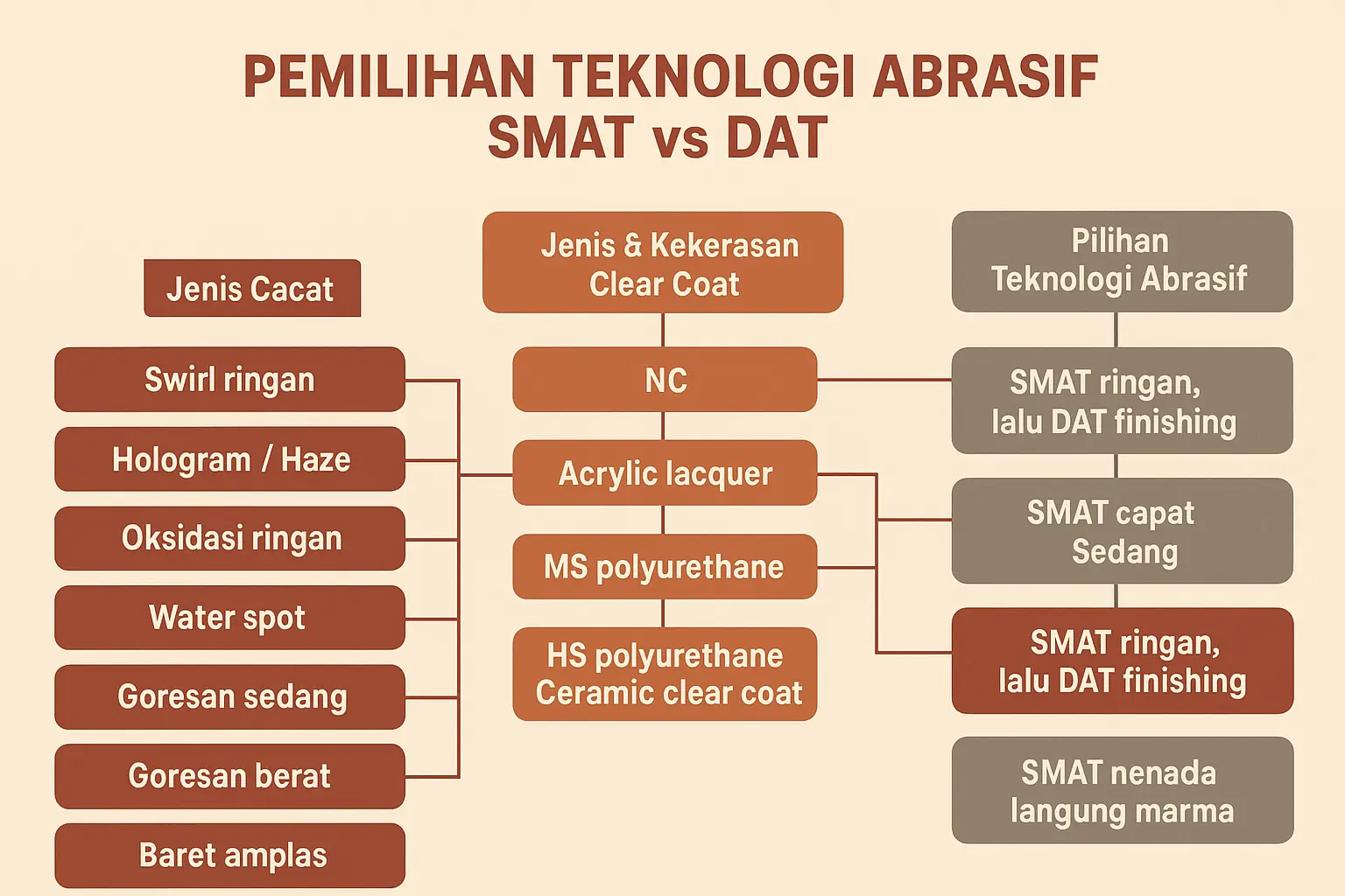 Dalam konteks paint correction, pemilihan SMAT atau DAT sangat memengaruhi hasil kerja. SMAT unggul untuk pekerjaan yang membutuhkan kecepatan, efisiensi, dan hasil seragam, terutama pada clear coat modern yang keras. DAT, meskipun lebih lambat, memberikan transisi alami ke tahap finishing, sehingga lebih cocok pada clear coat yang lunak atau pada detailer yang mengutamakan hasil halus tanpa goresan mikro (hologram).