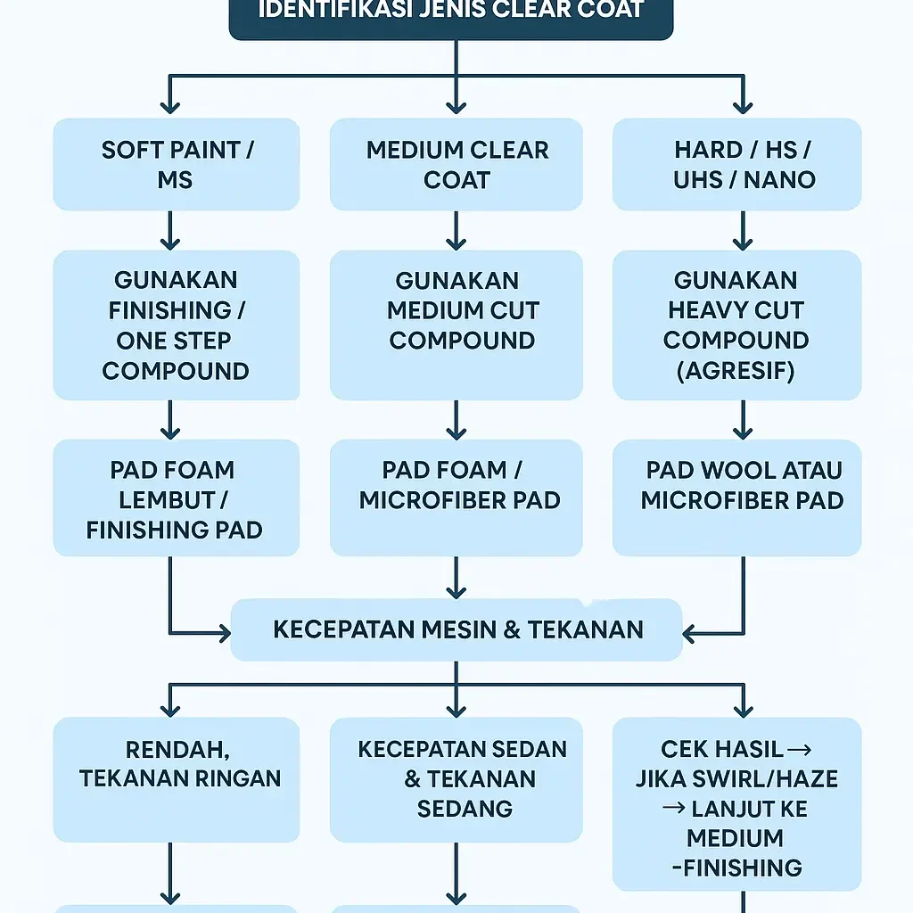 Dalam dunia detailing, mengenali jenis clear coat menjadi penting agar teknisi bisa menyesuaikan grit abrasif, tekanan, dan jumlah tahap koreksi. Pada soft paint, tahap koreksi bisa langsung one step menggunakan finishing compound halus. Namun pada hard clear coat, koreksi sering kali harus melalui beberapa tahap: heavy cut → medium cut → finishing.